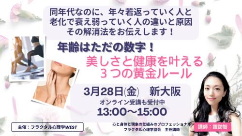 【会場&オンライン開催】3月28日 13:00~15:00年齢はただの数字!美しさと健康を叶える3つの黄金ルール講師:諏訪智先生主催:フラクタル心理学WEST 会場は満席となりましたので、オンライン受講のみ受け付けております。 オンライン受講でも、より多く…